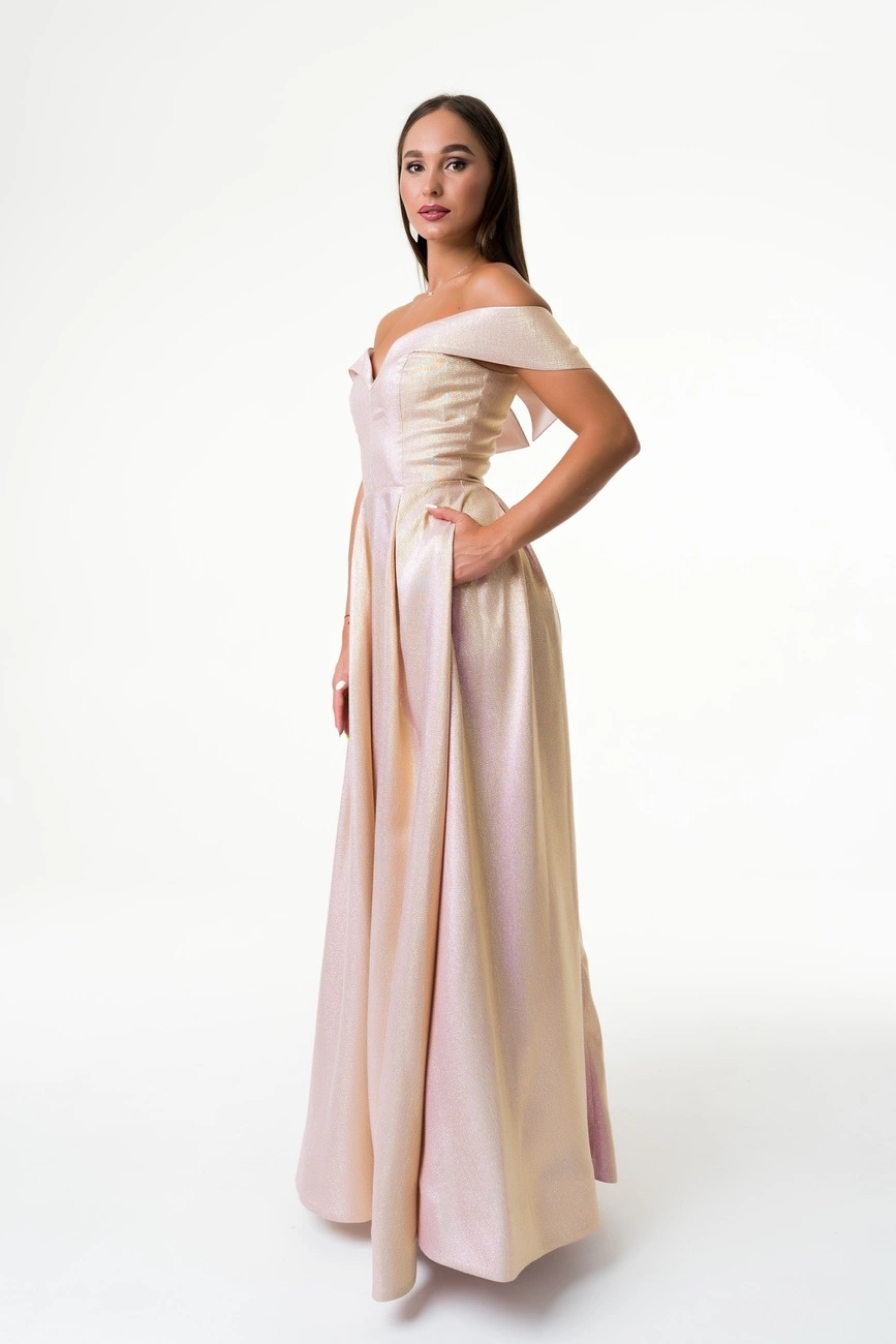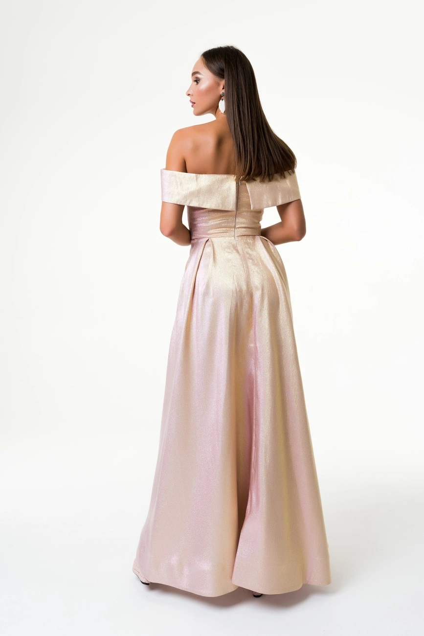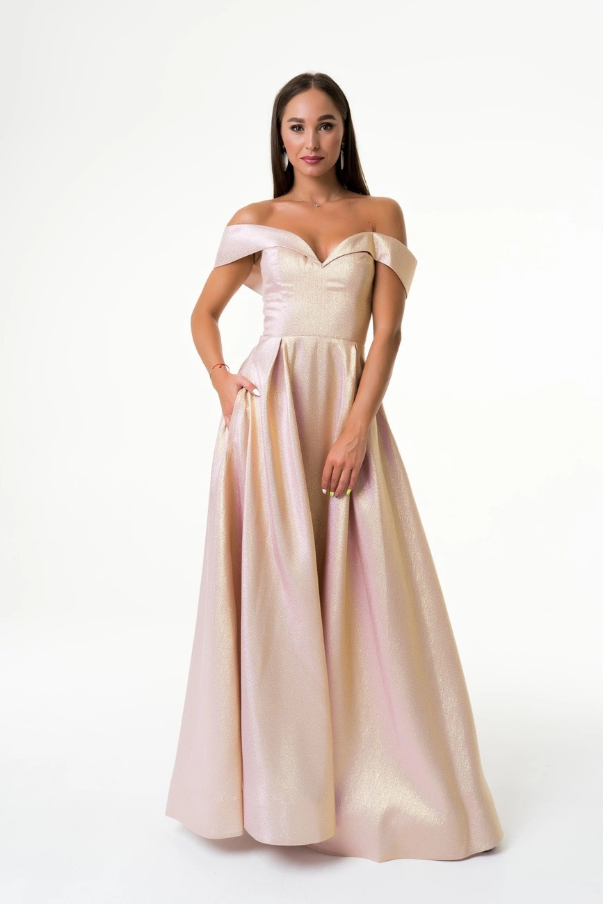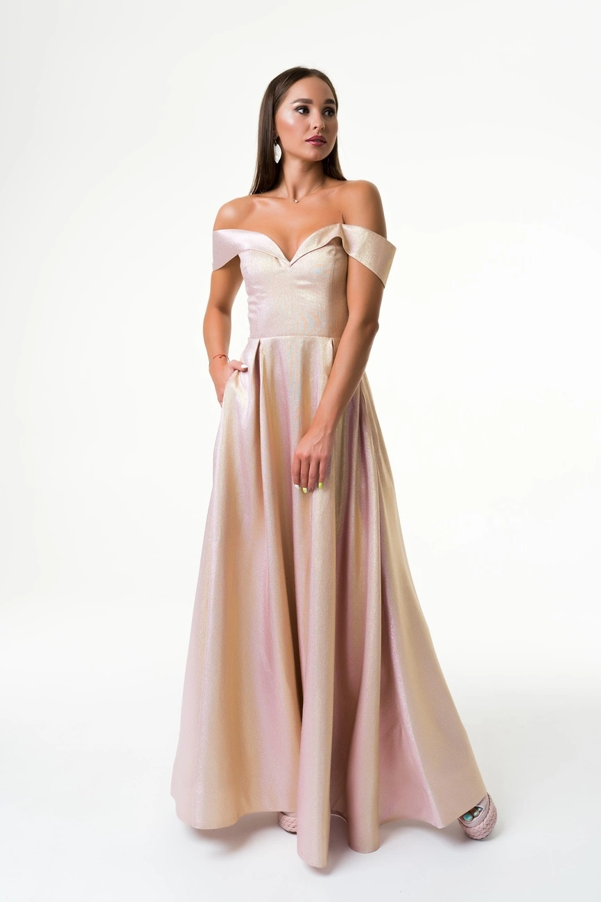 Вечернее жаккардовое платье с приспущенными плечами на корсетной основе.